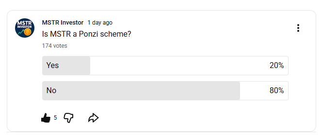 I ran a poll on the MSTR Investor Youtube channel to find out if investors think MSTR is just a ponzi scheme waiting to collapse. 20% of respondents believed that MSTR was a ponzi scheme to my surprise!